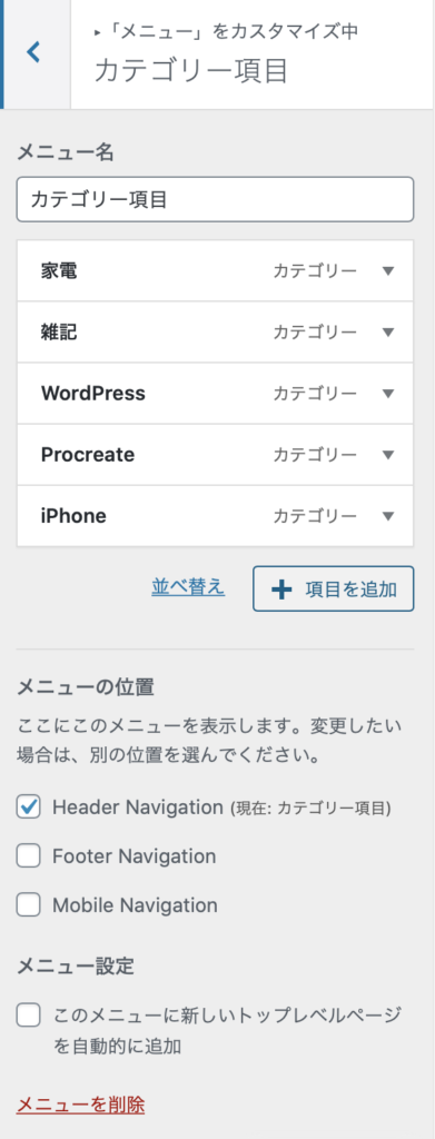 2020年8月2日 / 最終更新日時 : 2020年8月2日 nandemo WordPress メニューのカテゴリー項目表示の追加方法 WordPressのテーマ:lightningのメニューに表示するカテゴリーを追加するフローをメモしておきます。 外観→カスタマイズ→メニュー→カテゴリー項目→「+項目の追加」を選ぶ Follow me! FacebooktwitterHatenaPocket コメントを残す コメントをキャンセルメールアドレスが公開されることはありません。 * が付いている欄は必須項目ですコメント 名前 * メール * サイト 次回のコメントで使用するためブラウザーに自分の名前、メールアドレス、サイトを保存する。